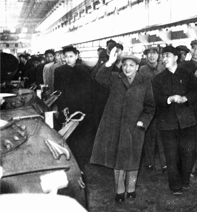 1964年4月8日中共中央總書記鄧小平視察617廠時(shí)在總裝車間向干部職工招手致意