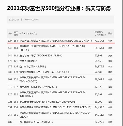 中國兵器工業(yè)集團有限公司位列世界500強第127位,連續(xù)12年上榜。