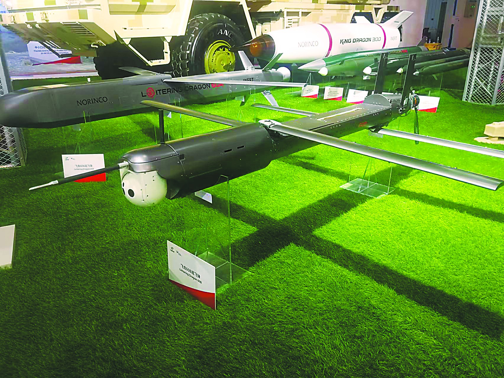 兵器工業(yè)集團展出的SR-5遠程火箭炮系統(tǒng)被稱為“中國版‘海馬斯’”,它的特點之一就是能共架發(fā)射“飛龍-60”巡飛彈,從而引導(dǎo)火箭炮對數(shù)百公里外目標(biāo)的遠程精確打擊。