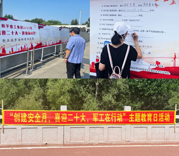 和平重工集團(tuán)在安全生產(chǎn)月期間組織開(kāi)展了“創(chuàng)建安全月 喜迎二十大 軍工在行動(dòng)”主題教育日活動(dòng),現(xiàn)場(chǎng)懸掛宣傳橫幅標(biāo)語(yǔ),工作人員為職工們發(fā)放安全知識(shí)宣傳冊(cè)、扇子等宣傳用品,并在現(xiàn)場(chǎng)組織了安全知識(shí)有獎(jiǎng)答題環(huán)節(jié),調(diào)動(dòng)廣大職工參與的積極性,大力營(yíng)造了“關(guān)愛(ài)生命、關(guān)注安全”的良好氛圍。